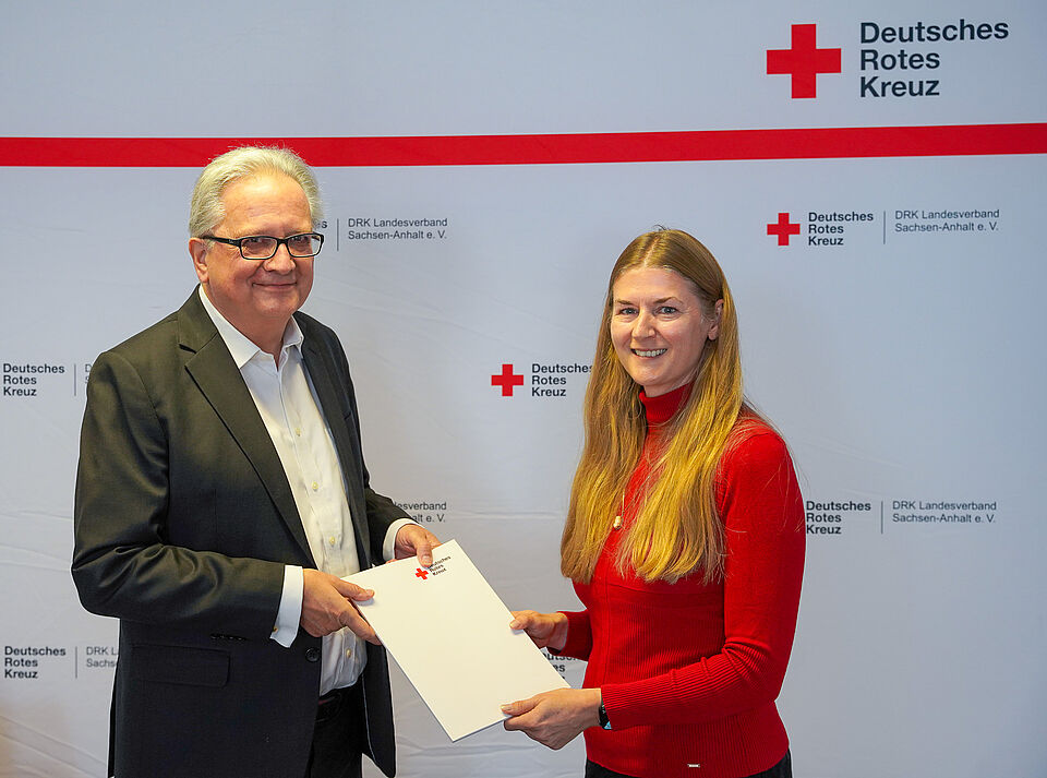 Die Spendenübergabe fand am 1. Oktober 2025 in der Landesgeschäftsstelle des DRK Sachsen-Anhalt in Magdeburg statt. Dr. Carlhans Uhle, Landesgeschäftsführer des DRK Sachsen-Anhalt, übergab dabei symbolisch die Spendengelder an Kerstin Godenrath, Landesvorsitzende des WEISSEN RINGS in Sachsen-Anhalt.